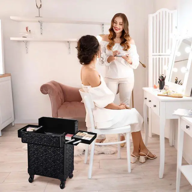 - Makeup Storage Solution - Rolling Makeup Train Case boasts 4 extendable trays on the top, open to display all your delicate cosmetics from lipsticks, eye palettes to nail polishes, and a spacious space underneath for extra storage of setting spray, hair stylers, hair dryers, and bottles