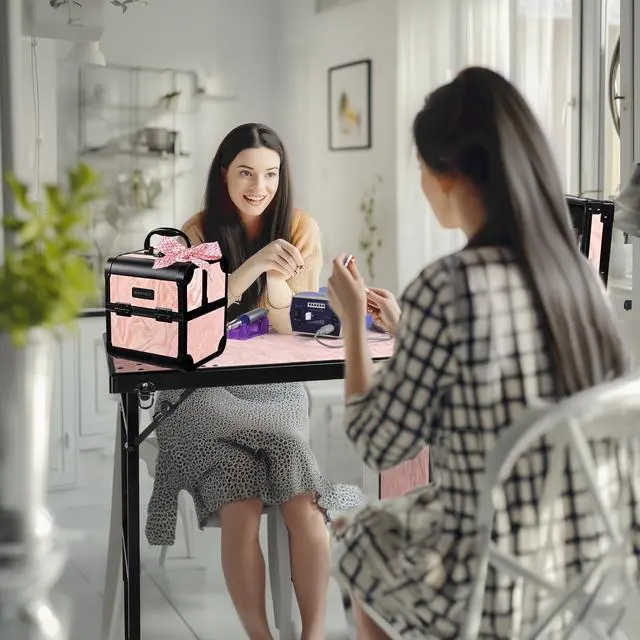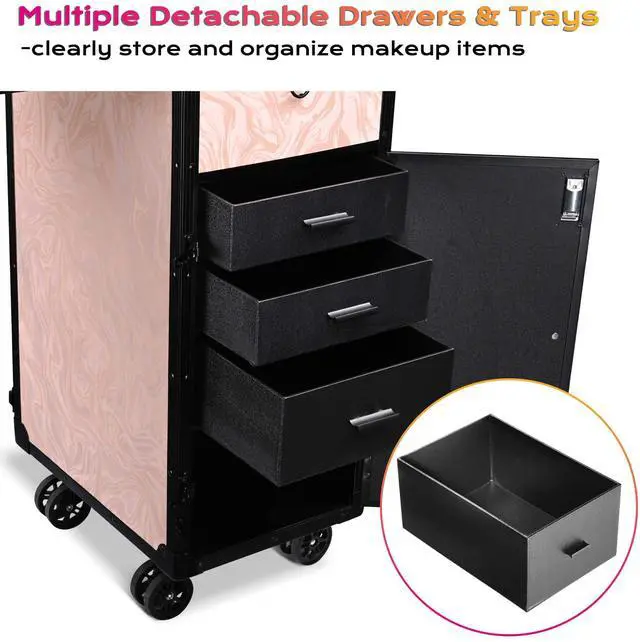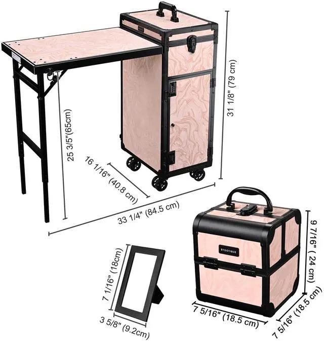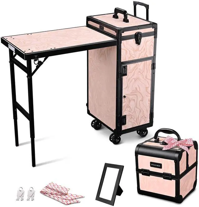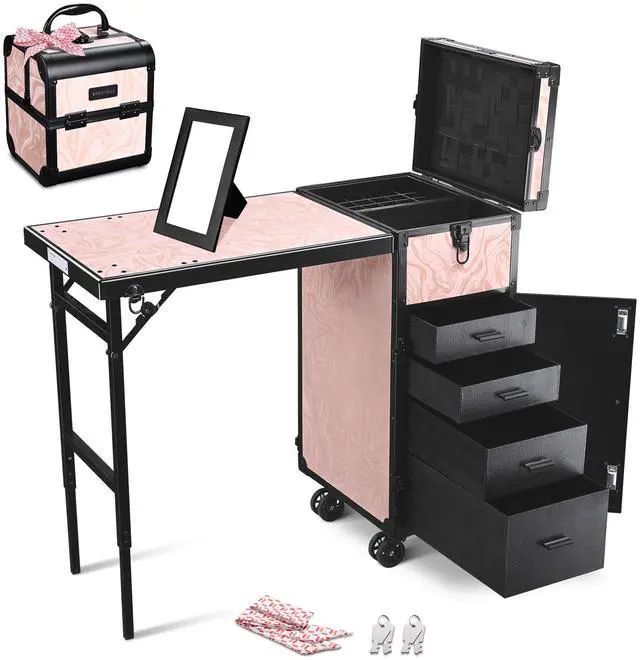 - Mobile Makeup Studio - Features an expandable floor-standing table for serving as either a trolley case or a nail art workstation, along with foldable design allowing it to be folded into a trolley case with 360-degree swivel and detachable wheels for easy movement and replacement