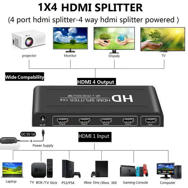 1. 1x4 hdmi splitter One Input Port: Compatible for computer, XBox 360, XBox one, PS3, PS4, Fire Stick, Blu-Ray DVD player, Satellite Receiver, Route Roku, Chromecast, PC, Projectors etc.