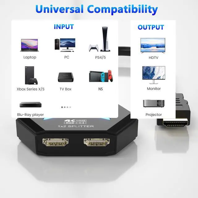 HDMI Splitter 1 in 2 Out Duplicate/Mirror (Not Extend), 4K@60hz HDMI Splitter for Dual Monitors for Full HD, 1080P, 3D, Compatible with Xbox, PS4, PS5, TV, Projector, Computer