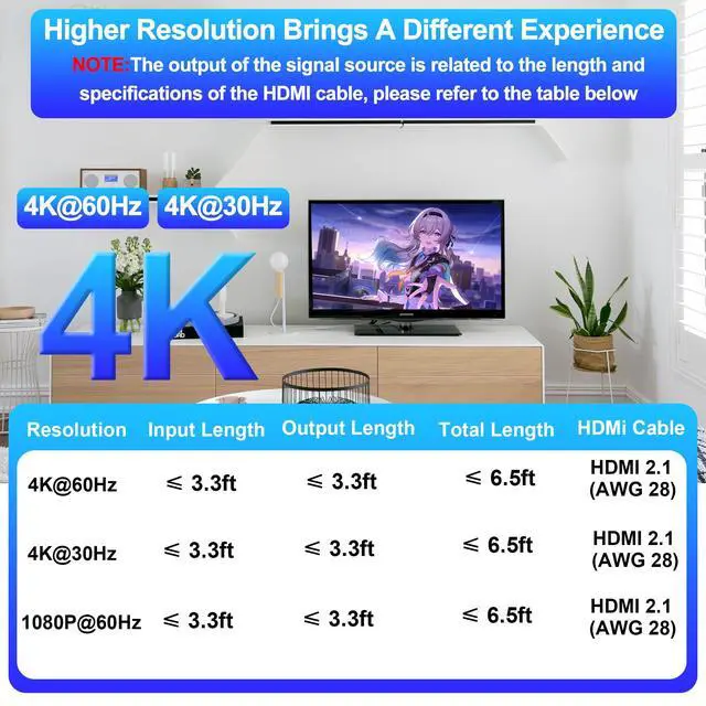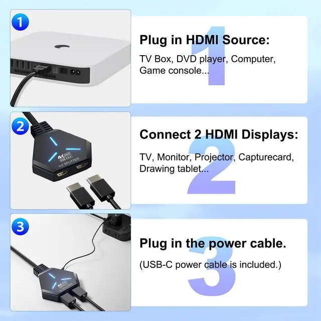 HDMI Splitter for Dual MonitorsCompatible with most HDMI sources, the dual HDMI adapter distributes one HDMI signal to two HDMI devices so you can enjoy the same picture with family and friends in two different rooms at the same time without having to change rooms. Standard HDMI cables up to 10 meters are recommended. (Note: If the overlong between the splitter and screen, please use the the extra power supply included in the product