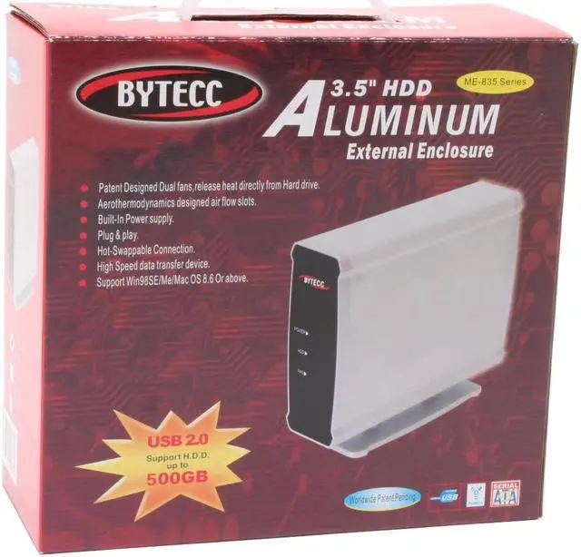 | Package Contents | 3.5" Aluminum Dual Fans Enclosure USB2.0 Cable Power Cord Cable Driver Disk |