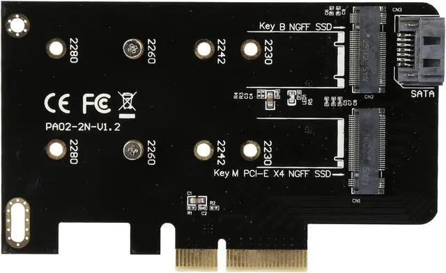 The BYTECC NGFF (M.2) to PCIE Adapter gives you an easy and convenient way to improve your computer system performance and expand overall internal storage. It lets you easily connect one SATA-based* B key NGFF m.2 SSD and one PCI-E 4X-based** M key NGFF m.2 SSD to your computer motherboard at the same time. It delivers blazing-fast data transfer rates of up to 6Gbps, ensuring ultra-fast data access.