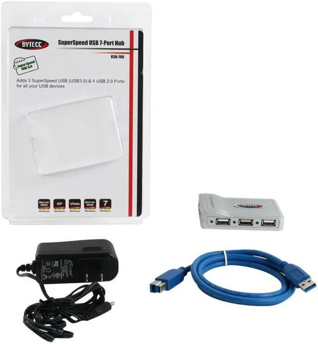 The BYTECC U3H-700 USB hub instantly adds up to seven USB ports - three USB 3.0 and four USB 2.0 - to your computer, great for slim notebook or Ultrabook with less than enough USB connectivity. You can hook up various peripherals, like USB flash drive, external HDD, printer and more, without the worry of running out of onboard ports. Each port has an LED indicator to display status. An AC adapter is included to provide enough power when power-hungray device or multiple peripherals are connected. Compliant with USB 3.0 & 2.0 specifications Adds three SuperSpeed USB 3.0 & four USB 2.0 ports for your USB devices Supports USB Low-speed ( 1.5M bps) / Full-speed (12Mbps) / High-speed (480Mbps) / Super-speed (5Gbps) Advanced design keeps optimal speeds when using multiple USB devices simultaneously Self-power Plug & play