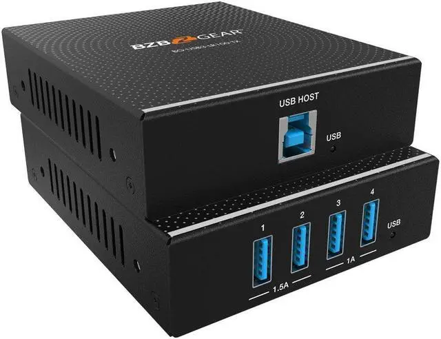 One of the standout features of the BG-USB3-LR100 is its backward compatibility with USB 2.0 and 1.1, ensuring seamless integration with older devices. It also includes hardware acceleration for isochronous and bulk transfers, enhancing performance for demanding applications. The receiver's USB-A ports provide ample power, with ports 1 and 2 delivering 5V/1.5A and ports 3 and 4 offering 5V/1A, catering to a variety of USB device power requirements.