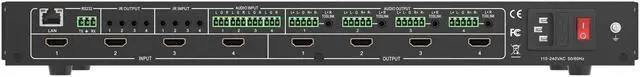 The four HDMI ports support video bandwidths of 18Gbps and resolutions up to 4K@60Hz (4:4:4). The HDMI ports are HDMI 2.0 and HDCP 2.2 compliant. Each HDMI input features stereo audio embedding via the phoenix connectors on the back panel. The device is equipped with four stereo audio outputs and four TOSLINK S/PDIF ports for analog and digital audio de-embedding.