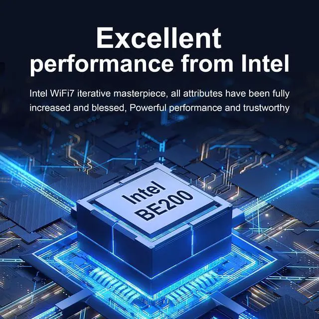 • Intel BE200 chipset, peak rate up to 9.3Gbps • 160-320MHz frequency range, 4X capacity of 802.11ax • Smooth streaming, gaming, and transferring