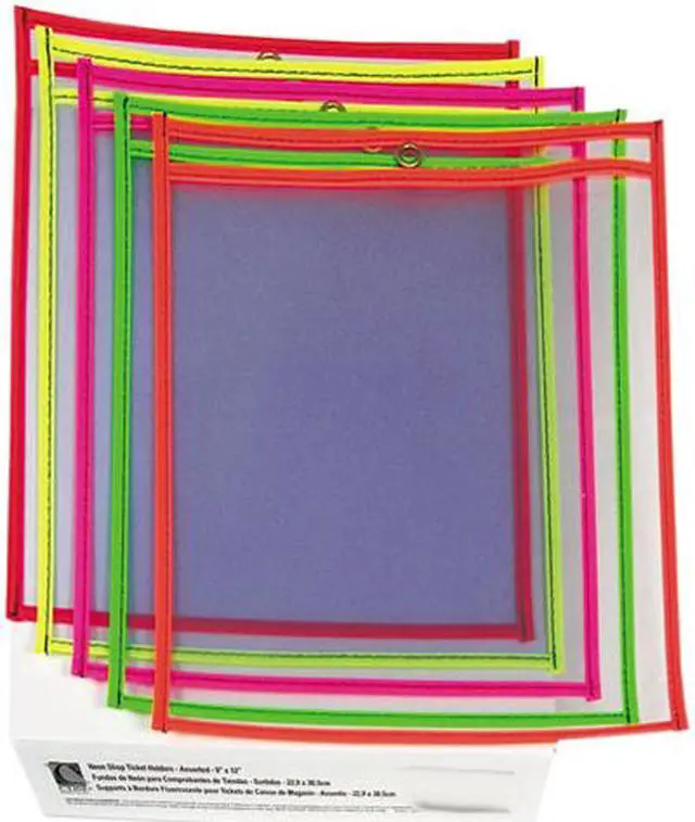 Neon stitched, super heavyweight shop ticket holders let you color code important paperwork and make special jobs stand out. Works great for organizing work by department, day-of-the-week or importance. Sturdy, clear vinyl construction allows for easy visibility of 9" x 12" documents and stitched seams ensure long-lasting utility. These easy-to-identify shop ticket holders have a metal eyelet on the top for hanging. Clear front and back with neon-colored stitching. Load Orientation: Top; Sheet Capacity: 75; Sheet Protector Type: Shop Ticket; Insert Size: 9" x 12".