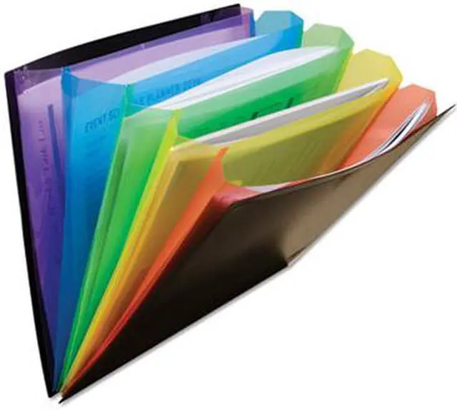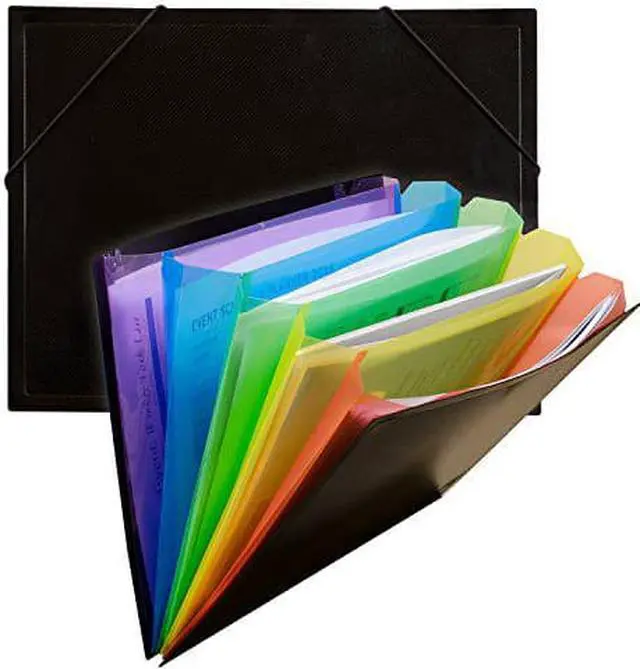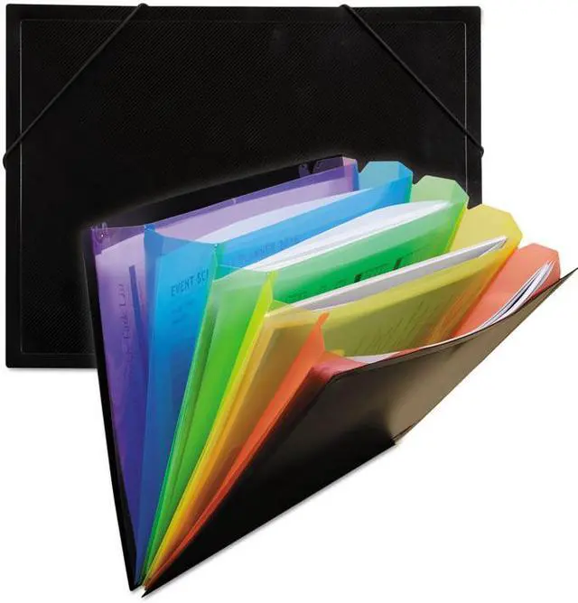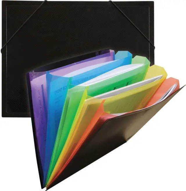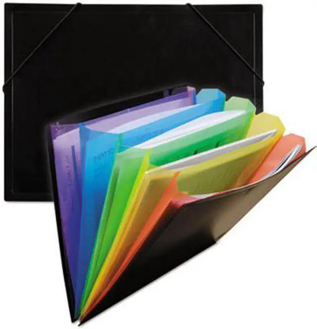 Compact, convenient carrier and sorter. Durable, acid-free polypropylene features a black exterior and five colorful interior pockets. Keep papers secure with elastic closure. Holds up to 250, 8 1/2" x 11" sheets. Pocket/Wallet Type: Files/Papers; Size: Letter; Overall Expansion: 5"; Closure Type: Elastic Cord.
