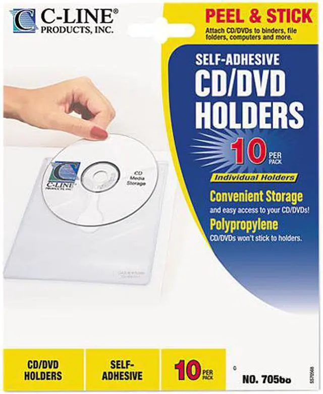 Store discs safely with these white CD holders. The self-adhesive design allows for these holders to be easily attached to binders, folders, and other items, so you can access CDs quickly when giving proposals, reports, and other presentations. These C-Line Products CD holders are made from sturdy polypropylene, offering added durability and preventing glare for easy title viewing.