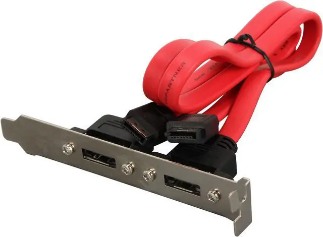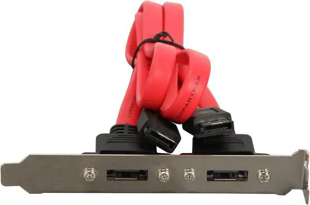 SATA 3.0 compatible with transfer rates up to 6 Gbps! This external eSATA slot plate adapter adds two external eSATA ports to any serial ATA controller, and allows you to take the high speed of SATA outside your computer case. Just install the adapter plate into an open I/O slot on your computer; it easily fits into any PC slot. Then connect the cables to the serial ATA connectors on your motherboard or SATA controller card. Then you'll be able to connect external SATA drives that use the new eSATA connector. Length of base to the end of the cables is 20.5 inches.