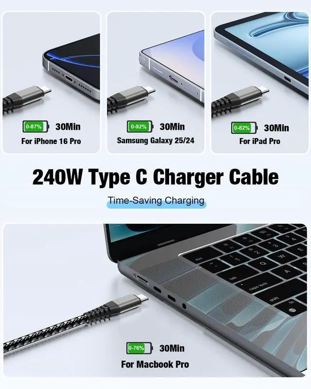 Adds premium strong fiber, can withstand 50000+ bending, which can effectively extend the 240W USB C to C Fast Charging Cord life
