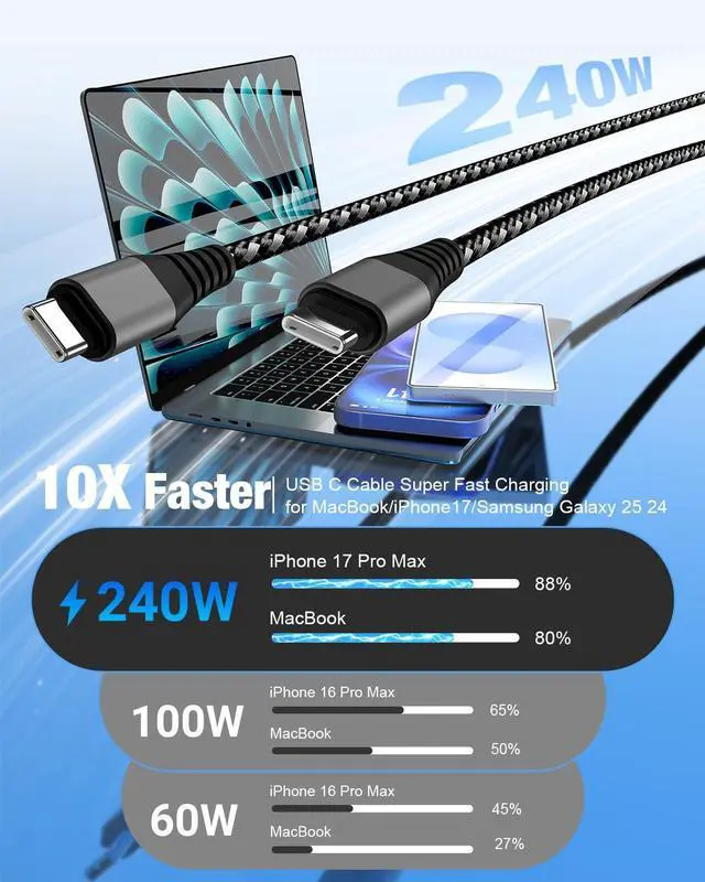 ![Main image of 240W USB C to USB C Cable [2-Pack 6FT+10FT], USB C to C Fast Charging Cord, Braided Type C to Type C Cable for iPhone 17/16/15/Samsung S25/S24/MacBook/iPad/Switch/Android Phones&Laptops-Black](https://c1.neweggimages.com/productimage/nb640/C5JMD26030408MJ3GF7.jpg)