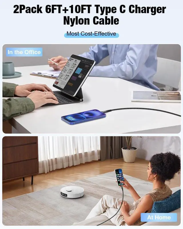 Comes with 2 pack USBC to USBC cables with the length needed most daily — 6ft(2m)+10ft(3m) for charging at your work seat or surfing in your cozy bed