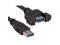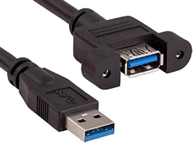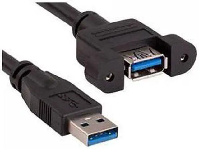 Newly designed USB 3.0 version of the panel mount style extension cables are now available! This panel mount extension cable features a USB 3.0 type A male connector on one end, and a USB 3.0 panel-mount (female) molded connector on the other end. The female panel end can be mounted on a faceplate, a wall plate, or a bulkhead surface. This creates a panel-mounted USB jack wherever you need it with minimal installation work. USB 3.0 (4.8 Gbps) provides 10 times the capability of the USB 2.0 (480 Mbps). USB 3.0 significantly reduces the time required for data transmission, reduces power consumption, and is downward compatible with USB 2.0.