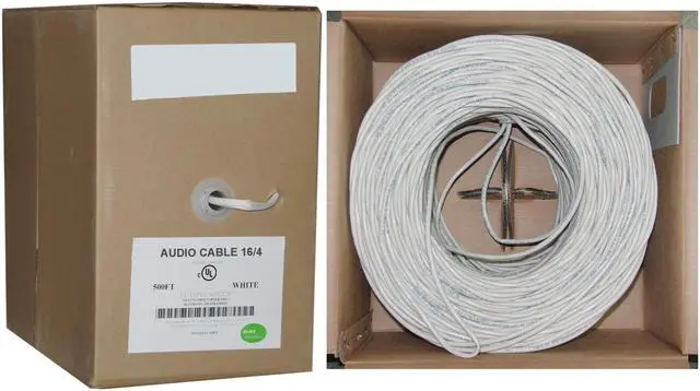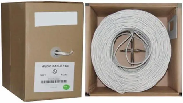 This white 16 AWG (American Wire Gauge) 4 conductor Speaker cable is CM rated for in-wall use, though it need not be used strictly in-wall. It comes in a 500 foot pull box and is ideal for wiring the speakers in your home theater or house to your receiver. End 1: Bare end.
