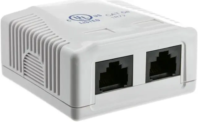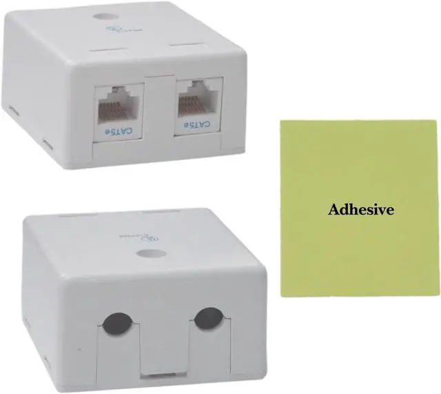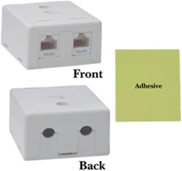 Cat 5e Duplex Surface Mount Box, Unshielded, Duplex CAT - 5E Surface Jacks (Female), White. This unit comes with a flat piece of adhesive that enables it to be attached directly to the wall without the need of tools. This unit can support 2 CAT - 5E connections.