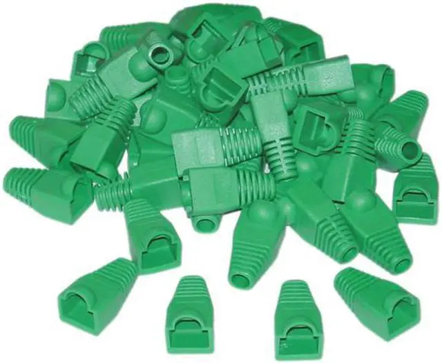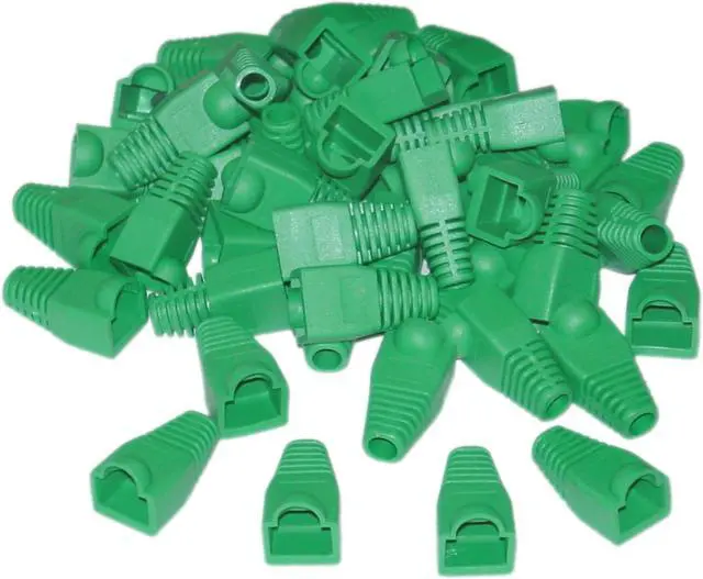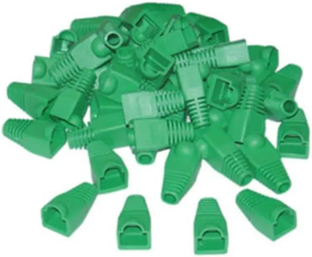 RJ45 Strain Relief Boots, Green (50 Pcs Per Bag). These boots are designed to fit over the end of a CAT-5 / CAT-6 to relieve the strain on the connector and to clean up the cosmetics of the cable. The boots come in Blue, Black, Beige, Red, and Green.