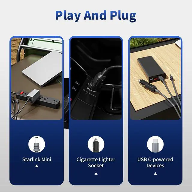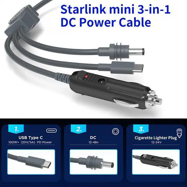 Designed specifically for the Starlink Mini, this 3-in-1 charging cable combines a USB-C cable, cigarette lighter plug, and DC male power connector for seamless power delivery wherever you are.