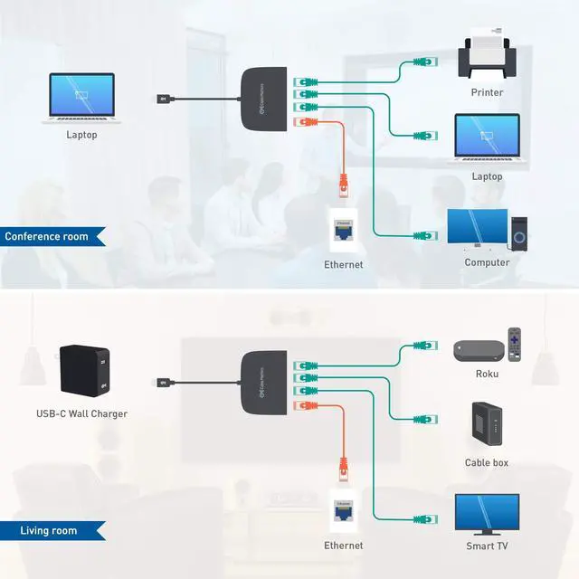 The switch connects up to four devices to a wired Ethernet network through RJ45 and USB-C. It is useful in a variety of situations at home and at the office. Bring the adapter to a conference room to share wired Internet with a laptop via USB-C, and a variety of other Ethernet-based devices like printers and other laptops. At home, provide wired Internet access to a cable box, smart TV, and streaming device for latency-free and full-speed Gigabit networking.