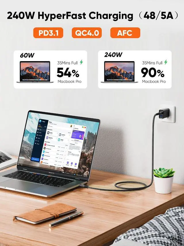 3.Up to 240W 48V@5A Pass through supporting Power Delivery, comparable to the full speed original cord (Actual charging speed depends on your device and wall charger, with 96W original charger at a full 96W, with 45W orginal charger at a full 45W).