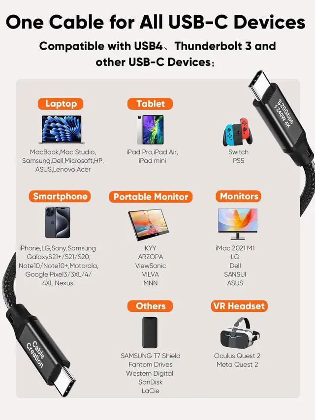 1.This is USB C to USB C 3.2 Gen 2.2 Cable, not a Thunderbolt Cable, compatible with USB 4,Thunderbolt 3 Port and other USB C devices. Not compatible with Thunderbolt 4 Port.