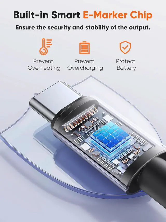 The integrated E-Mark Chip Protection provides intelligent power management and comprehensive safety for your connected devices and charging adapters.