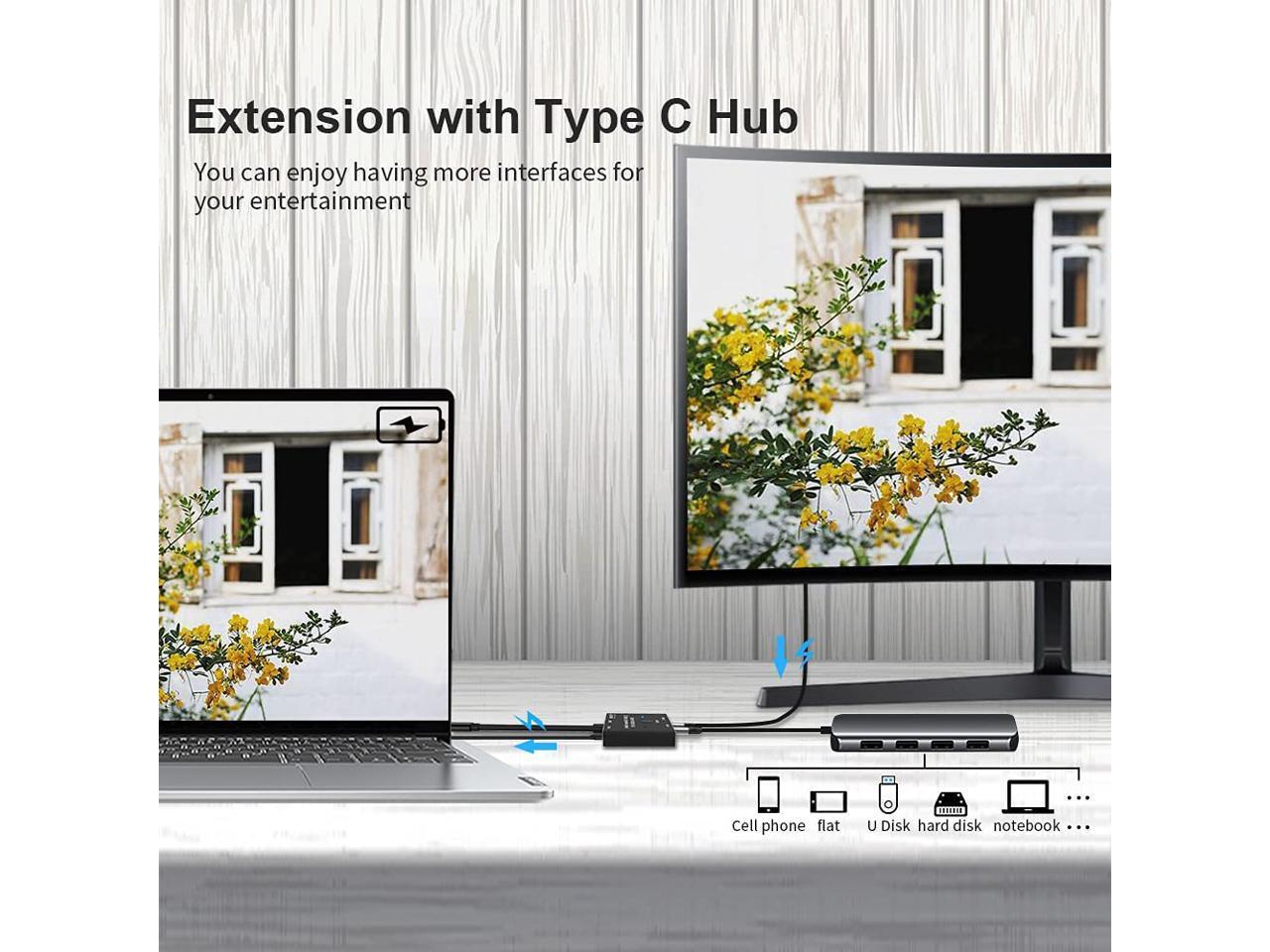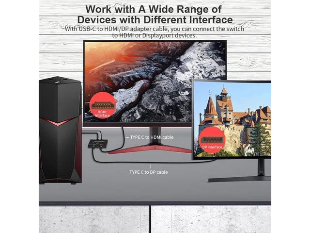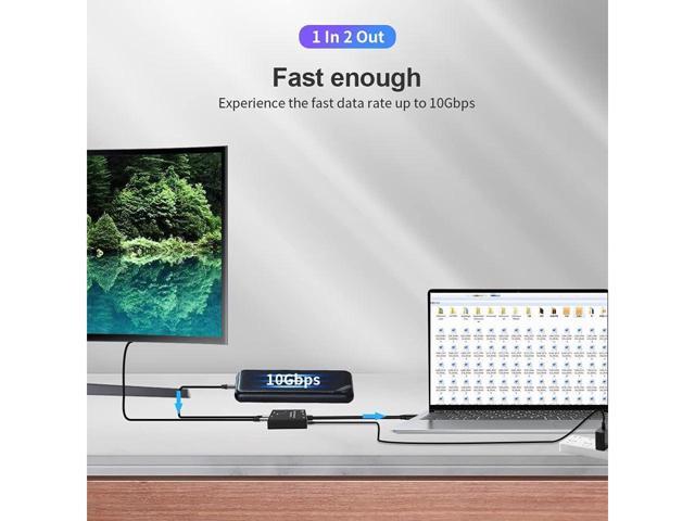 - USB-C 8K Splitter for Two Displays 1in 2Out,you are allowed to connect the source device from the USB C end via the supplied fixed USB C Cable,then connect to two USB-C displays to the port "USB-C 1" and port "USB-C 2"in the switch..