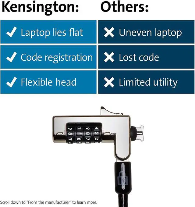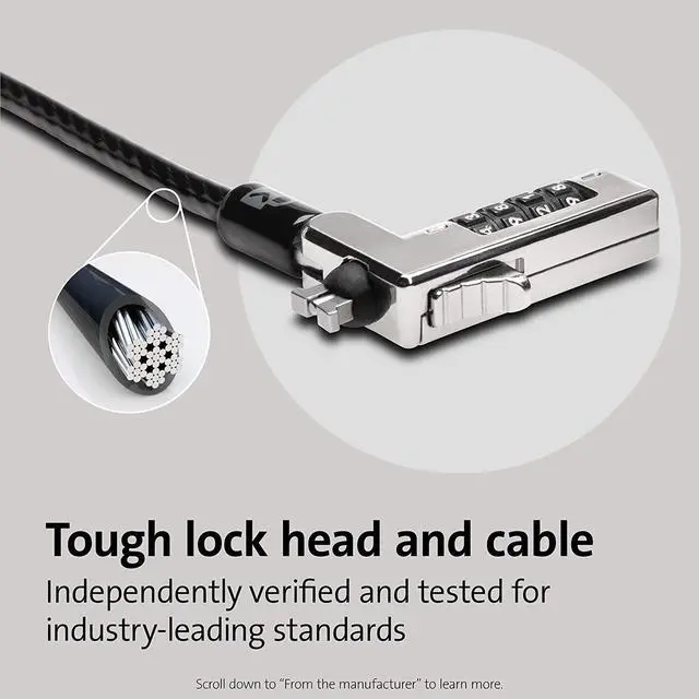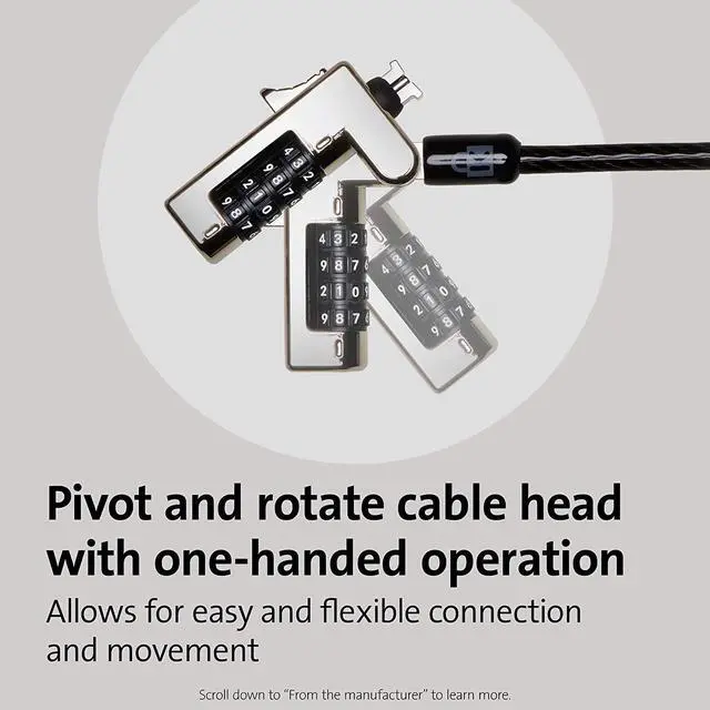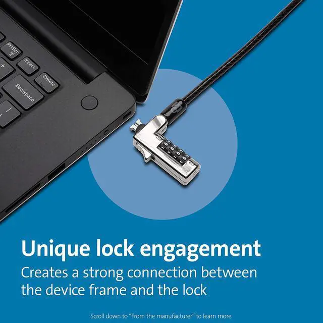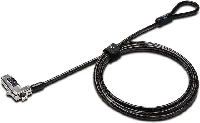 Laptop lock for thin and light HP, Lenovo, Acer, Asus and other brands; not compatible with Dell or Alienware (see part # K68008WW)Slim lock head design won??t raise your ultra-thin or 2-in-1 laptop off its surface, allowing it to lie flat and stable. Pivot and rotate cable head featuring one-handed operation allows for easy and flexible connection and movementResettable 4-wheel Number code with 10, 000 possible combinations. Push-button design for one-handed engagement to easily attach lockUnique lock engagement creates the strongest connection between the lock head and slot; 6' long carbon steel cable is cut-resistant and anchors to desks, tables or any fixed structure2 year Warranty and lifetime technical support not valid if purchased from Tech for Less or SaveCentral