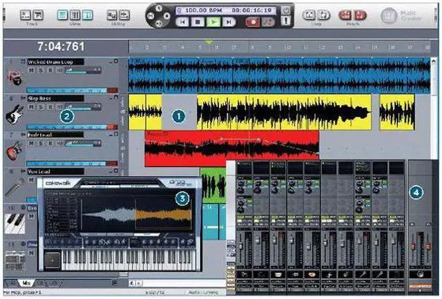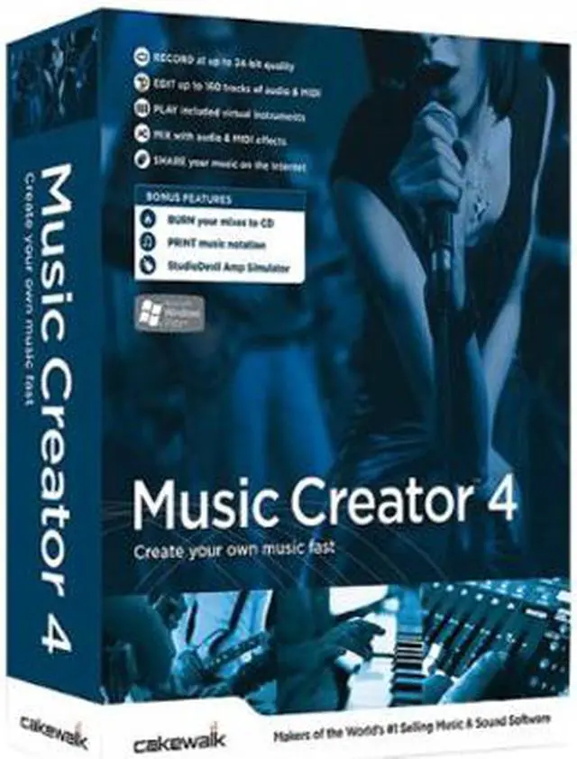 | Feature | Start making music right from your home computer with Music Creator 4. Just plug in and hit Record. No matter what you want to record—guitars, keyboards, vocals, CD samples, or any other sound source—Music Creator makes it easy to start making and recording music. Up to 160 total tracks (32 audio and 128 MIDI) Professional 24-bit audio quality Create backing tracks using included ACID™-format loop library Play and record using thousands of high-quality instrument sounds 25 studio effects including an Amp Simulator, EQ, Delay, Compressor, Reverb, more On screen mixer to seamlessly mix all your audio and MIDI tracks Add more instruments and effects with support for DirectX, VST, and ReWire Built-in audio metronome and tuner Create and print your own musical scores and sheet music Create online music players of your songs to share on the Internet Create playlists and burn CDs for fans, family, and friends |
