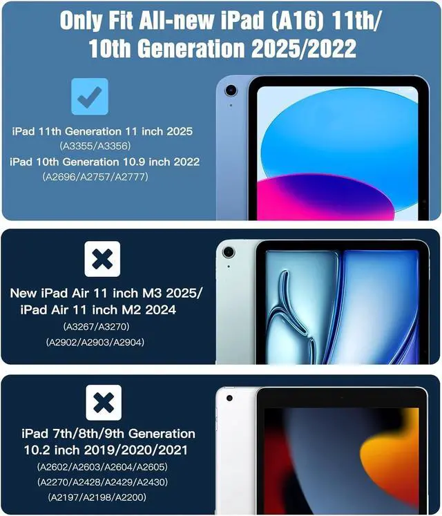 Compatibility: Preciously designed for iPad (A16) 11th generation 11 inch 2025 (Model: A3354 A3355 A3356) iPad 10th generation 10.9 inch 2022 (Model: A2696 A2757 A2777 A3162). Please check the back bottom of your ipad to find the model numberGreat