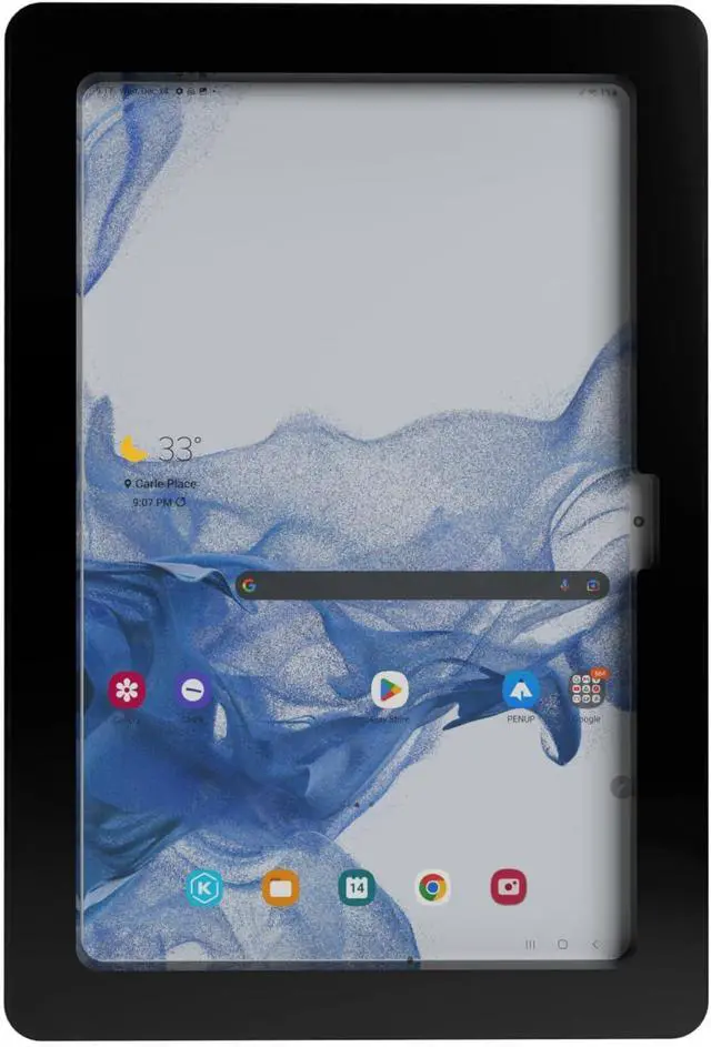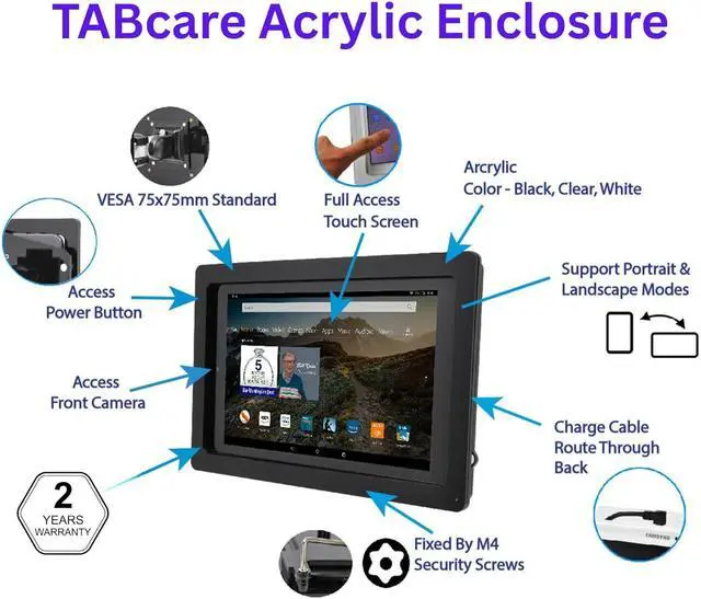 A9 8.7D imension: 190mm (Height) x 25mm (Depth) x 287mm (Width); weight: 1.2 lbUsed as Time Clock POS Kiosk Store Display Trade Show displayMaterial: Acrylic 8mm thickness Six security screws (come with one screw driver) Support both Landscape and Portrait Display Modes. Total Screen Access For Full Touch Function anti-theft security design