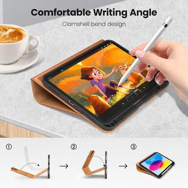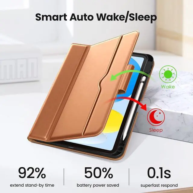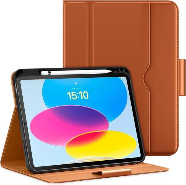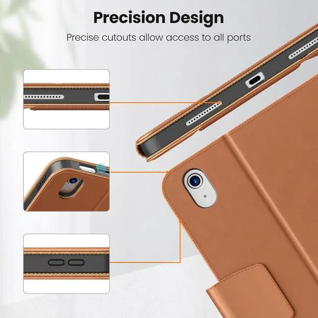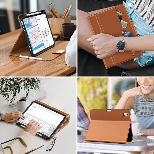 Note: NOT compatible with other iPad modelsFull Protection - Using high quality environmental protection synthetic leather and TPU material feel comfortable and easy to clean. Anti-collision Angle design to better protect your iPad 10th. Features front document card pocket to keep notes cash cardsBuilt-in Pencil Holder - Securely carries and protects your pencil wherever you go. A hole has been designed at the back of the pencil holder that you can easily push pencil out without taking off your iPad 10 caseMagnetic Smart Cover - Support Auto Wake/Sleep built-in leather hand strap(one-handed operation) and external elastic band enhances magnetic closure (reduces battery drain) Adjustable Angle - The non-slip fabric and deep groove design give you two viewing angles. The clamshell bend design provides you with a firmer and more comfortable typing Angle