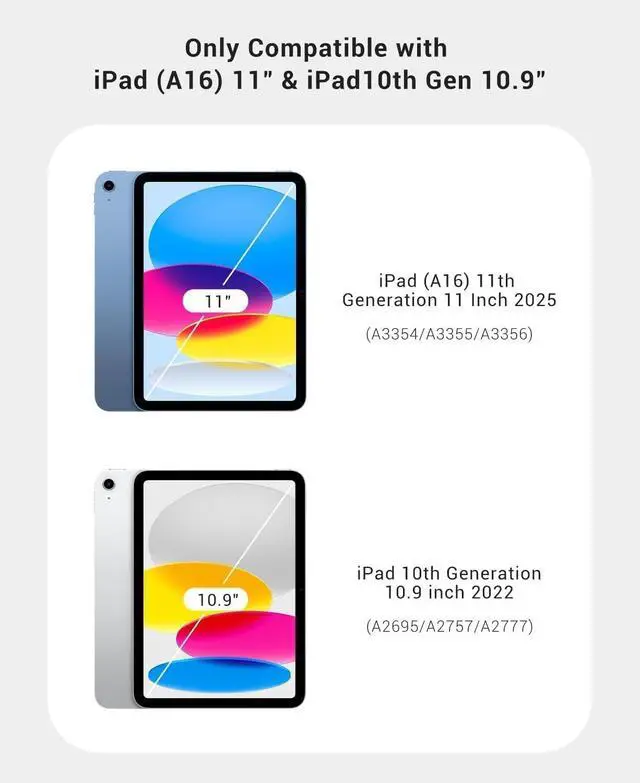 Compatibility: Only Design for iPad (A16) 11th generation 2025 11 inch (Model: A3354 A3355) and iPad 10th generation 2022 10.9 inch (Model: A2696 A2757) iPad (A18) / (A19) 12th Generation 11 Inch