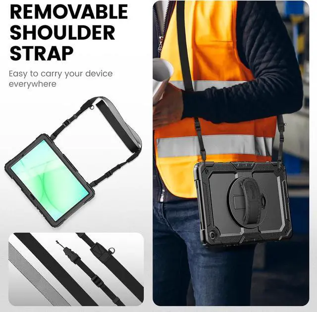 FUNCTIONALITY: 360° rotating stand with 5 positions for video calls notes or viewing; Detachable shoulder strap for commutes; Anti-slip hand strap secures during outdoor work; Dedicated pencil holder for hiking/transportDURABILITY