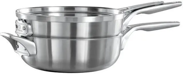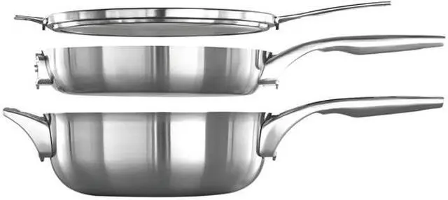 | Special Features | Stacks and Nests Unique shaped cookware lets you easily stack and nest cookware with the same diameter. 8" diameters stack with other 8" diameter products, 10" diameters stack with 10" diameter products, and 12" diameters stack with other 12" diameter products. 3-Layer Construction Durable and long-lasting, each stainless steel cookware item is crafted with a heavy-gauge aluminum core for excellent heat conduction. With even heating across the pot or pan, meals turn out perfectly for family and friends. Stainless Steel Handle(s) Pans such as sauce pans and fry pans feature a long, stainless steel handle that remains cool while cooking on the stovetop. Dishwasher Safe Spend less time in the kitchen. After all the cooking and prepping is done, place cookware in the dishwasher for fast and easy cleanup. Tips for Stacking Cookware Cookware with the same diameters stack and nest in any order. For example, a 2.5 qt. sauce pan has an 8" diameter. Look for other 8" diameter products to complete your stack. For the most efficient space saving, starting from the bottom, stack cookware in order from shallowest to deepest with lids on top. |