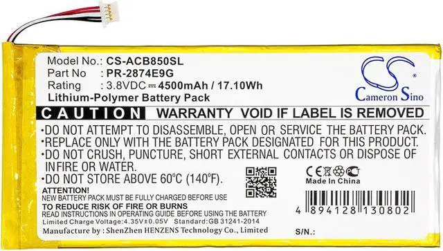 Battery Part Numbers PR-2874E9G Capacity: 3.8V 4500mAh / 17.10W h
