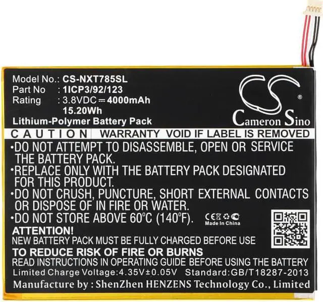 Battery for Nextbook NX785QC16G NX785QC8G 1ICP3/92/123 Tablet CS-NXT785SL 3.8 v Compatible with the following devices NX785QC16G, NX785QC8G Compatible with Battery Part Numbers 1ICP3/92/123