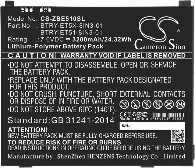 Battery for Zebra ET51 ET51 Windows OS ET51AE-W12E ET51AT-W12E ET51CE-G21E-00NA Compatible with the following devices ET51, ET51 Windows OS, ET51AE-W12E, ET51AT-W12E, ET51CE-G21E-00NA, ET56 Compatible with Battery Part Numbers BTRY-ET51-8IN3-01, BTRY-ET5X-8IN3-01
