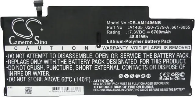 Battery for Apple A1466 MacBook Air "Core i5" 1.6 13" MacBook Air "Core i7" 1.8 Compatible with the following devices A1466, MacBook Air "Core i5" 1.6 13", MacBook Air "Core i7" 1.8 13", MacBook Air (MD232CH/A), MacBook Air (MJVE2CH/A), MacBook Air (MJVG2CH/A), MacBook Air 13" MC503, MacBook Air 13" MC504, MacBook Air MD760CH/A, MC503, MC504, MD760CH/A, year 2012 Compatible with Battery Part Numbers 020-7379-A, 020-8142-A, 661-6055, A1369, A1405