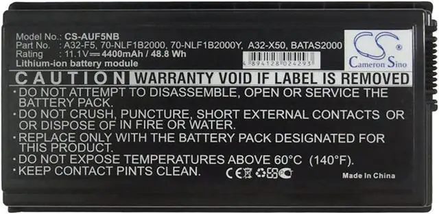 Battery for Asus F5 F5GL F5M F5N F5R F5RI F5RL-AP060C F5RL-AP460C F5SL Compatible with the following devices F5, F5GL, F5M, F5N, F5R, F5RI, F5RL-AP060C, F5RL-AP460C, F5SL, F5SL-AP177D, F5SR, F5SR-AP089C, F5V, F5VI, F5VL, F5VL-A2, F5Z, Pro 50m, Pro 50RL, Pro 50V, Pro 50VL, Pro 50z, Pro 55GL, Pro 55GL-AP368l, Pro 55SL, Pro 55SL-P302c, Pro 55SR-AP062c, Pro 58, Pro 58SA-AS020c, Pro 58SA-AS025c, Pro 58vc, Pro 58vvn-ap037c, Pro 59l, Pro 59l-ap012l, Pro 5b, Pro 5c, X50, X50C, X50M, X50N, X50N-AP026c, X50R, X50RL, X50RL-AP354c, X50SL, X50V, X50VL, X58, X58LE, X59s Compatible with Battery Part Numbers 70-NLF1B2000, 70-NLF1B2000Y, 70-NLF1B2000Z, 90-NLF1B2000Y, A32-F5, A32-X50, BATAS2000
