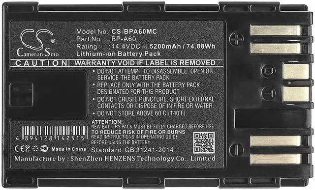Battery Part Numbers BP-A60 Capacity: 14.4V 5200mAh / 74.88W h