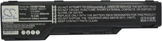 Battery for DELL XPS M1730 312-0680 HG307 WG317 Notebook Laptop CS-DE1730NB Compatible with the following devices XPS M1730 Compatible with Battery Part Numbers 312-0680, HG307, WG317