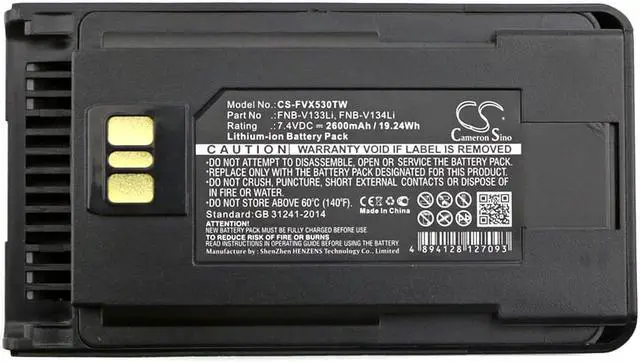Two-Way Radio Battery for Vertex AAJ67X001 AAJ68X001 FNB-V133Li FNB-V134Li Compatible with the following devices EVX-231, EVX-261, EVX-530, EVX-531, EVX-534, EVX-539, VX-260, VX-261, VX-451, VX-454, VX-456, VX-459, YAESU EVX-530, EVX-531, EVX-534, EVX-539, VX-260, VX-261 Compatible with Battery Part Numbers AAJ67X001, AAJ68X001, FNB-V133Li, FNB-V134Li, FNB-V138Li, YAESU AAJ67X001, FNB-V133Li, FNB-V134Li, FNB-V138Li
