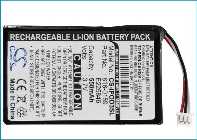 Battery for Apple iPOD 10GB M8976LL/A iPOD 15GB M9460LL/A iPOD 20GB M9244LL/A Compatible with the following devices iPOD 10GB M8976LL/A, iPOD 15GB M9460LL/A, iPOD 20GB M9244LL/A, iPOD 30GB M8948LL/A, iPOD 3th Generation, iPOD 40GB M9245LL/A Compatible with Battery Part Numbers 616-0159, E225846