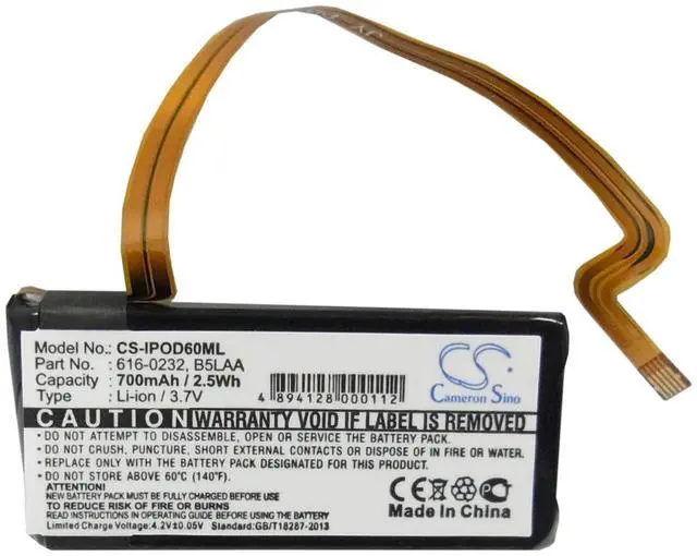 Battery for Apple iPOD Classic 120GB iPOD Classic 160GB iPOD Video 60G iPod Compatible with the following devices iPOD Classic 120GB, iPOD Classic 160GB, iPOD Video 60G, iPod Video 60GB MA003*/A, iPod Video 60GB MA003CH/A, iPod Video 60GB MA003DK/A, iPod Video 60GB MA003FD/A, iPod Video 60GB MA003J/A, iPod Video 60GB MA003KH/A, iPod Video 60GB MA003LL/A, iPod Video 60GB MA003TA/A, iPod Video 60GB MA003X/A, iPod Video 60GB MA147*/A, iPod Video 60GB MA147CH/A, iPod Video 60GB MA147DK/A, iPod Video 60GB MA147FD/A, iPod Video 60GB MA147HK/A, iPod Video 60GB MA147J/A, iPod Video 60GB MA147KH/A, iPod Video 60GB MA147LL/A, iPod Video 60GB MA147TA/A, iPod Video 60GB MA147X/A, iPOD Video 80G, iPOD Video MA003LL/A, iPOD Video MA147LL/A, iPOD Video MA448LL/A, iPOD Video MA450LL/A, iPOD Video MB565LL/A, iPOD Video MB686LL/A, Microsoft JS8-00003, Zune 1089, Zune 1090, Zune 1091, Zune 30GB, Zune JS8-00001, Zune JS8-00002 Compatible with Battery Part Numbers 616-0232, 696-0106, B5LAA, B6DAH, Microsoft