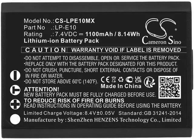 Battery Part Numbers LP-E10 Capacity: 7.4V 1100mAh / 8.14W h