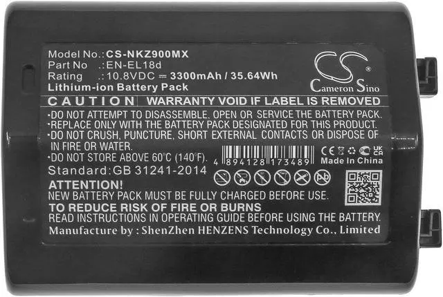 Battery for NIKON D6 Z9 EN-EL18d Camera CS-NKZ900MX 10.8 v 3300mAh / Compatible with the following devices D6, Z9, D4, D4s, D5, Nikon D850 (with adapters/grips) Compatible with Battery Part Numbers EN-EL18d, upgrade of EN-EL18 a/b/c versions