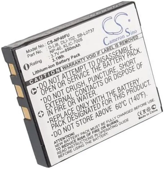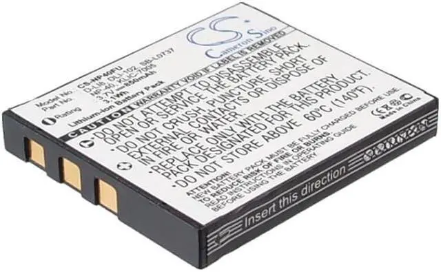 Battery for Samsung Digimax #1 Digimax I5 Digimax i50 Digimax i50 MP3 Digimax i6 Compatible with the following devices Digimax #1, Digimax I5, Digimax i50, Digimax i50 MP3, Digimax i6, Digimax i70, Digimax L50, Digimax L60, Digimax L70, Digimax L700, Digimax L73, Digimax L80, Digimax NV3, Digimax NV7 OPS, Rollei DA10, DB60, DP60, DX63, DX68, Tribute DT6, PENTAX Optio A10, Optio A20, Optio A30, Optio A40, Optio L20, Optio S, Optio S4, Optio S4i, Optio S5i, Optio S5n, Optio S5z, Optio S6, Optio S7, Optio SV, Optio Svi, Optio T10, Optio T20, Optio W10, Optio W20, Optio WP, Optio Wpi, Optio X, Fujifilm FinePix 455 Zoom, FinePix F402, FinePix F455, FinePix F455Zoom, FinePix F460, FinePix F460 Zoom, FinePix F470, FinePix F470 Zoom, FinePix F480, FinePix F610, FinePix F610 Zoom, FinePix F650, FinePix F650 Zoom, FinePix F700, FinePix F700 Zoom, FinePix F710, FinePix F810, FinePix F810 Zoom, FinePix F811, FinePix J50, FinePix V10, FinePix V10 Zoom, FinePix Z1, FinePix Z1 Zoom, FinePix Z2, FinePix Z3 Zoom, FinePix Z5fd, Kodak EasyShare C763, Ricoh Caplio 10G, Polaroid, MH-45503, PR-130DG, Medion Life P42010, Life P42012, Life S47000, MD85416, MD85866, MD86064, BenQ DC X600, X600, SVP CDC-650, CDC-8640, HDDV-2880, HDDV-T200, SX-650, T-200, XTHINN-508, XTHINN-508S, XTHINN-864, XTHINN-870, XTHINN-875, XTHINN-970, Praktica DC 52, DCV50, DCZ 10.3, DVC 5.1 HDMI, DVC 5.2 FHD, DVC 6.1, DVC 7.1Z, HD 11.0 i, HDi9, I8, LB-5030, LM 12-HD, LM 6105, LM 6403, LM 6503, LM 7203, LM 7303, LM 7403, LM 8303, LM 8403, LM 8503, luxmedia 10-23, Luxmedia 12-03, luxmedia 12-23, luxmedia 12-HD, Luxmedia 6015, Luxmedia 6105, Luxmedia 6403, Luxmedia 6503, Luxmedia 7105, Luxmedia 7203, Luxmedia 7303, Luxmedia 7403, luxmedia 8303, luxmedia 8403, Luxmedia 8503, M8, W0001, VIVITAR DVR-560G, Vivicam 3660, Vivicam 7388, Vivicam 7388S, Vivicam 7500i, Revue DC 5600 Slim, DC 600 Slim, TECHNIKA SH-Z735, Jenoptik EasyShot JD 5.3 z3, EasyShot JD 7.3 z3, Prosio, SlimNeo XT1600, JAY-tech JayCam i6550, JayCam Z630, Easypix DVC5308, DVC5308HD, S530, SDV1200, TS530, V600, VX1400, VX1400HD, VX600, VX6330, Braun D808, Strato DC2007 Compatible with Battery Part Numbers SB-L0737, SLB-0737, Rollei NP-40, PENTAX D-LI8, D-Li85, Fujifilm NP-40, NP-40N, Kodak KLIC-7005, Ricoh NP-40, Polaroid NP-40, Medion AK01, P42005, BenQ DLI-102, SVP NP-40, Praktica NP-40, VIVITAR NP-40, Revue NP-40, TECHNIKA WGL-0101, Jenoptik NP-40, Prosio NP-40, JAY-tech NP-40, Easypix NP-40, Braun NP-40, Strato