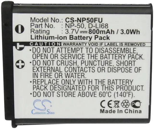 Battery for PENTAX OptioA36 OptioS10 OptioS12 Fujifilm FinePix F100fd FinePix Compatible with the following devices OptioA36, OptioS10, OptioS12, Fujifilm FinePix F100fd, FinePix F200EXR, FinePix F300EXR, FinePix F305EXR, FinePix F500EXR, FinePix F505EXR, FinePix F50fd, FinePix F550EXR, FinePix F600EXR, FinePix F605EXR, FinePix F60fd, FinePix F660EXR, FinePix F665EXR, FinePix F70EXR, FinePix F750EXR, FinePix F75EXR, FinePix F770EXR, FinePix F775EXR, FinePix F800EXR, FinePix F850EXR, FinePix F900EXR, FinePix X10, FinePix X20, FinePix XF1, FinePix XP100, FinePix XP150, FinePix XP170, FinePix XP200, Ricoh WG-M1, WG-M2, Jupio CFU0011 Compatible with Battery Part Numbers D-LI68, Fujifilm NP-50, NP-50A, Ricoh NP-50, NP-50A, Jupio NP-50, NP-50A